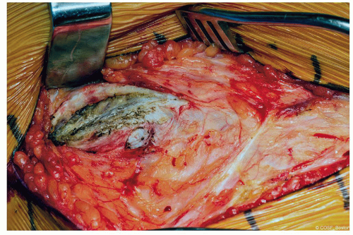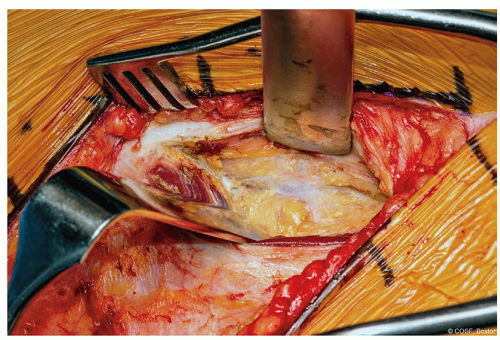 • Dissection is carried down to the rectus tendon through the tensor fascia envelope (Figure 21.5)