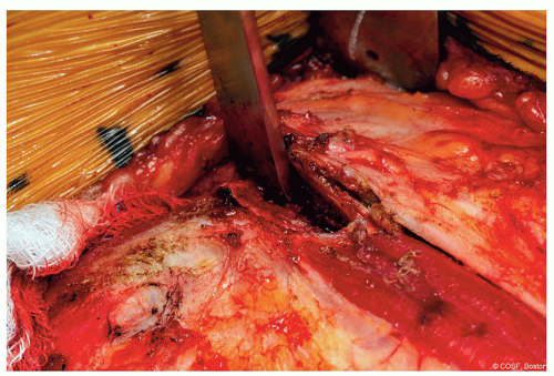 • Develop the interval between the psoas tendon and the capsule using meniscus scissors and pass the scissors down to the ischium (Figure 21.9)
