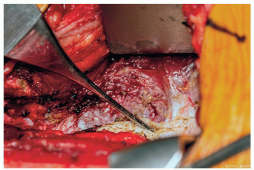 • You may slide the narrow Ganz osteotome down to the ischium by lifting the Lane retractor anteriorly and place the osteotome underneath