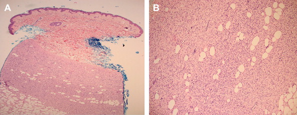 Clinical suspicion for DFSP following a complete skin examination typically requires an incisional skin biopsy to help confirm the diagnosis. Histological features suggestive of DFSP typically include a dense collection of monomorphous fusiform cells forming focal storiform or cartwheel configurations as demonstrated in Fig. 2 A . Early lesions may feature an area of dermal sparing, or a Grenz zone, which is clearly seen just beneath the epidermis. Coursing through the dermis and infiltrating the subcutaneous fat (see Fig. 2 B), an extensive proliferation of spindle cells disrupts the adipose tissue architecture and creates a honeycomb or lace-like appearance. Deeper projections into fascia or muscle can further complicate demarcation of the tumor border and subsequent surgical management. Determination of the precise surgical margin in DFSP can be challenging owing to the tumor’s bland histologic appearance and diffuse infiltration, as well as its similarity to other neoplasms. Occasionally DFSP can be difficult to distinguish from dermatofibroma, dermatomyofibroma, fibrosarcoma, leiomyoscarcoma, malignant fibrous histiocytoma (also called pleomorphic scarcoma), or atypical fibroxanthoma. Dermatofibromas have a tendency to be better demarcated and to have less infiltrative subdermal peripheral extension compared with DFSP. Malignant fibrous histiocytoma and atypical fibroxanthoma display greater mitotic activity and pleomorphism than DFSP.