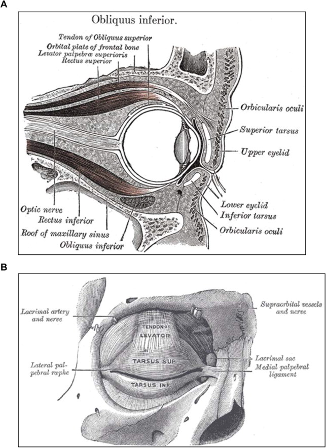 Anatomy of the lower eyelid. Sagittal section and support of the lower eyelid: coronal section.