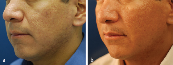 Fig. 10.1 A Hispanic man with acne scarring before (a) and after (b) laser resurfacing with 1550-nm erbium-doped fractional laser.