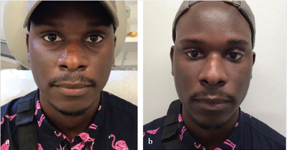 Fig. 10.2 A 37-year-old African American man before (a) and two weeks after (b) volumization with 2-mL hyaluronic acid filler in the midface.