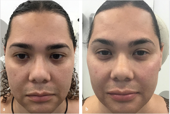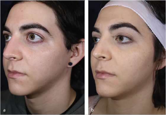 Fig. 11.2 (a) Before and (b) after facial fillers in the same patient resulted in additional widening at the temple, cheek, and tear trough with a softer and more rounded contour to the mandible and chin. The lips are subtly enhanced to reveal a more natural, feminine lip projection with elevated mouth corners.