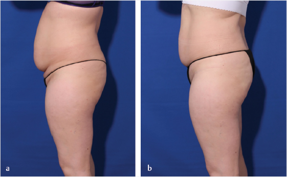 Fig. 11.8 (a) Before and (b) 2 months after abdominal cryolipolysis combined with three twice-monthly sessions of pulsed focused ultrasound in a transgender woman.