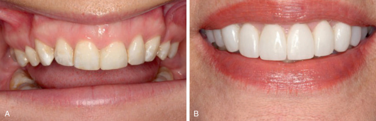 (A) The aesthetic problem—short teeth, disparity in gums, and tipped teeth in the buckle corners. (B) Treatment technique—orthodontic tooth movement, with surgical soft and hard tissue shaping.