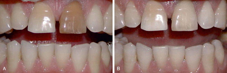 (A) The aesthetic problem—patient presented with a discolored tooth due to injury. (B) Treatment technique—included root canal and internal bleaching. This approach eliminates the need for a full crown.