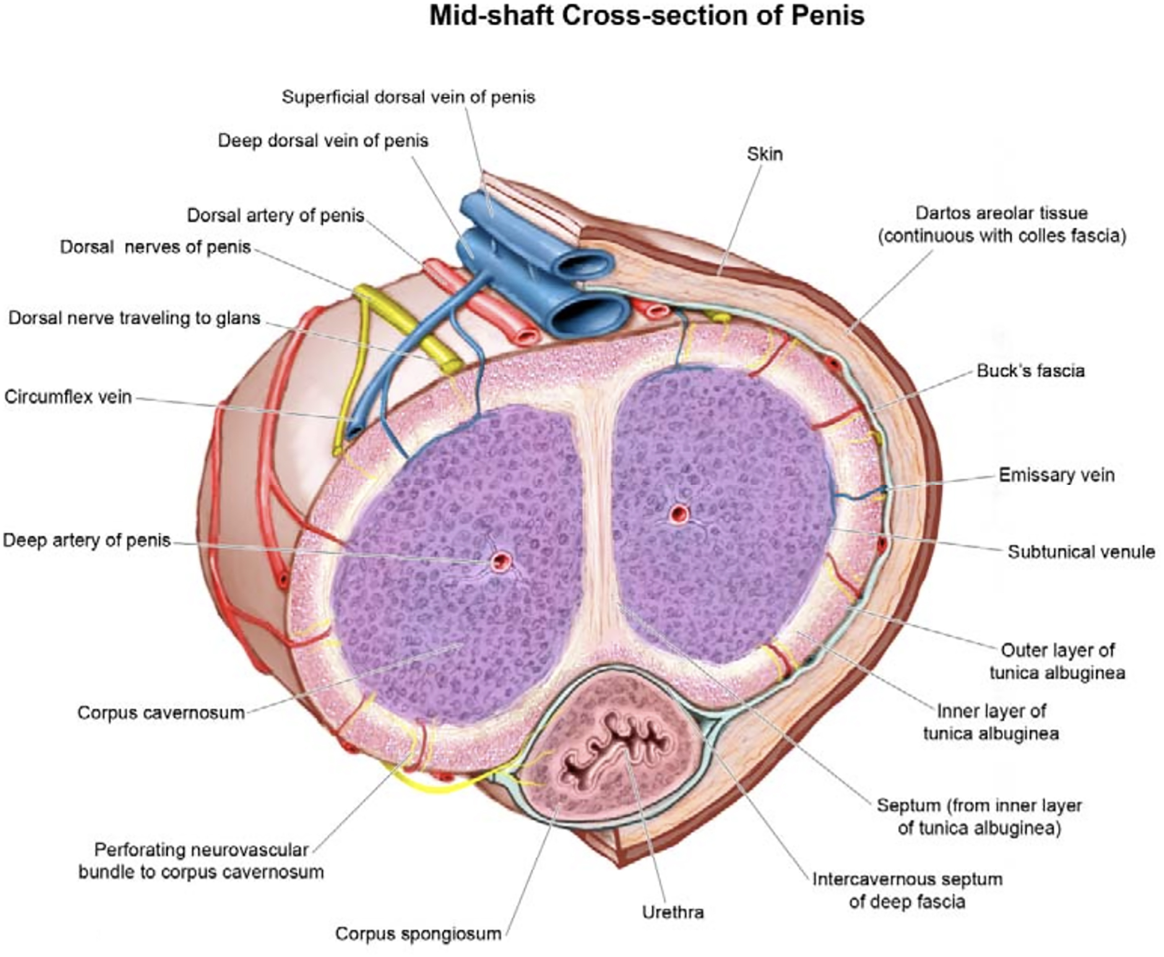 Each mass of erectile tissue is surrounded by layers of fascia. The tunica albuginea is a sturdy layer of fascia that surrounds each cavernous body. The next layer of fascia is called Buck fascia, otherwise known as the deep fascia of the penis. Buck fascia is a continuation of the deep perineal fascia and surrounds all 3 erectile bodies, holding them together. Immediately under the skin and the most superficial layer of fascia is called Colles fascia, which is a continuation of Scarpa fascia that covers the abdominal wall [ ].