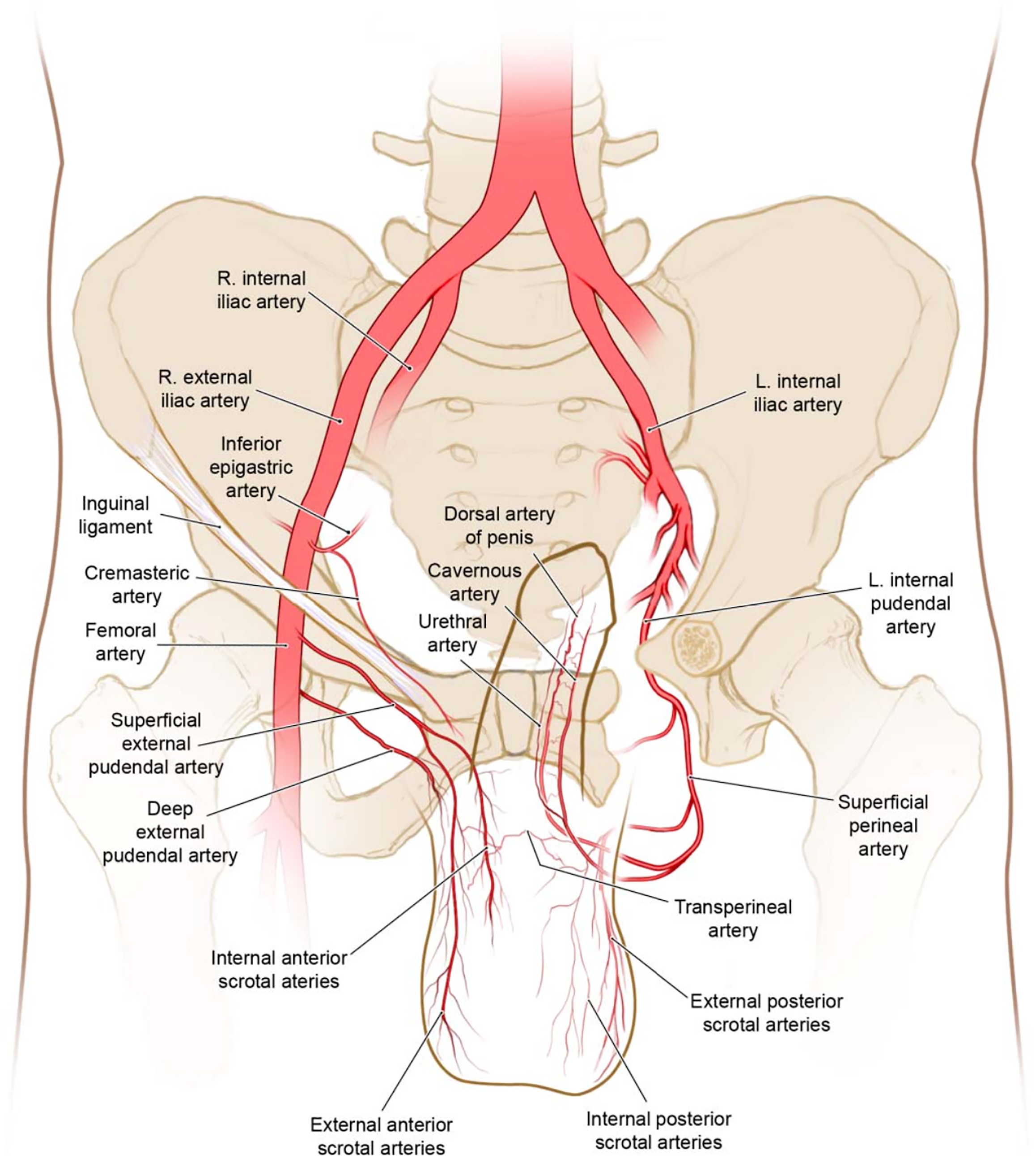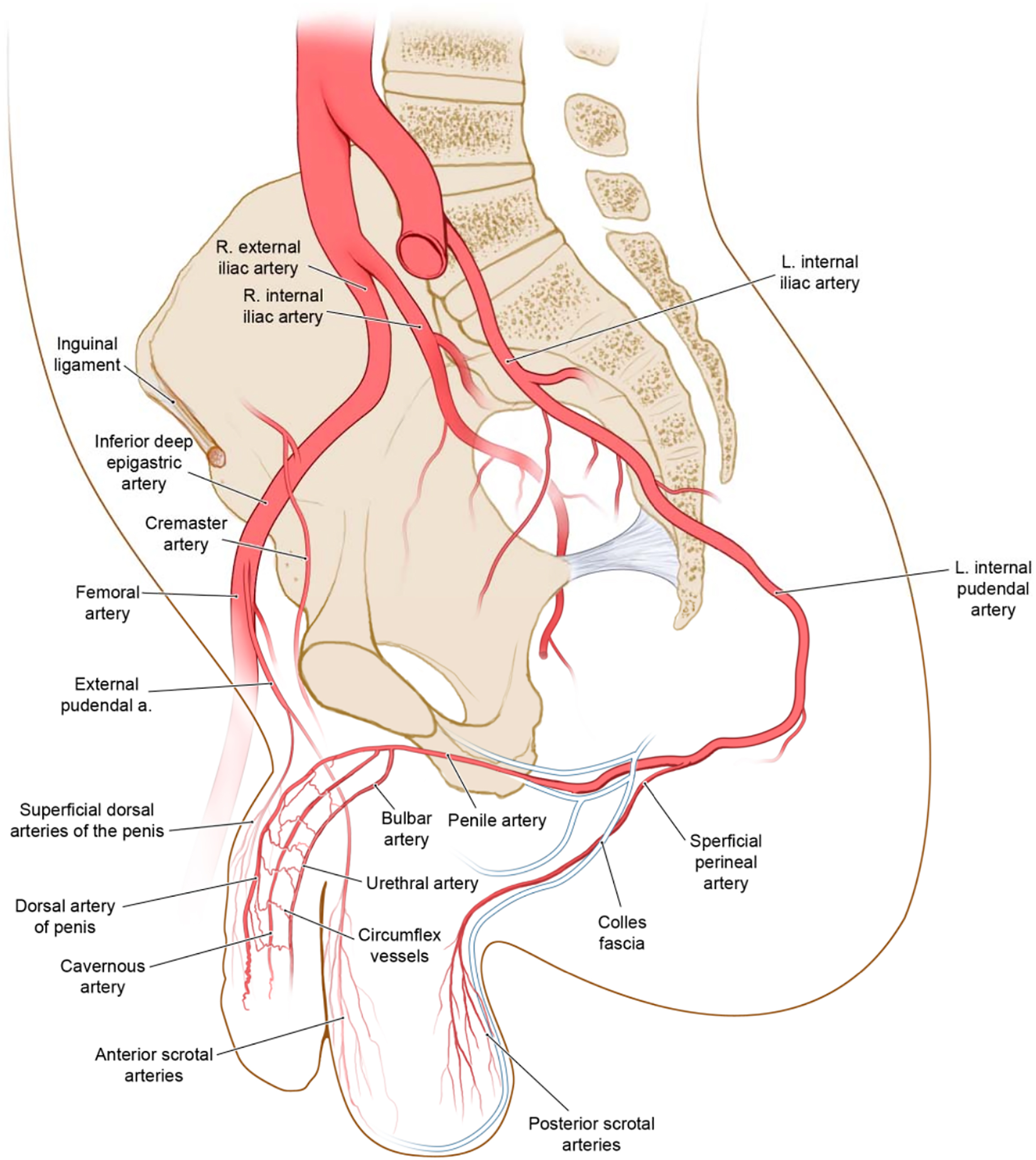 The male genitalia is supplied almost entirely by branches off of the internal and external pudendal arteries, which originate from the anterior division of the internal iliac artery ( Fig. 2 ).