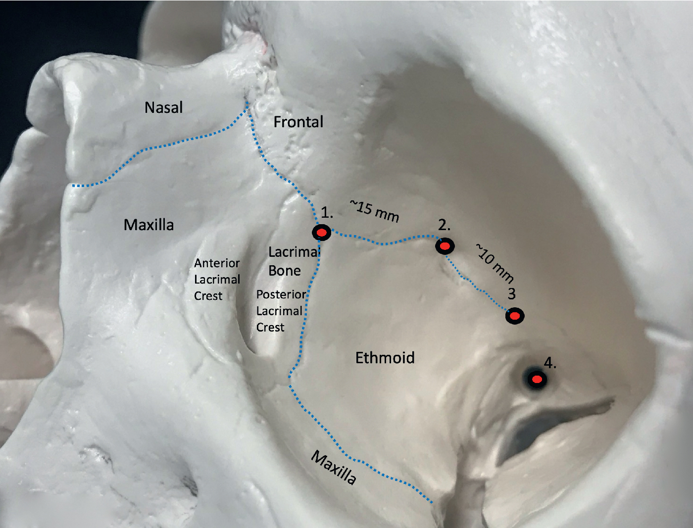 Located between the lacrimal bone and wedged between the anterior and posterior tendons is the nasolacrimal canal. Just above the canal is the lacrimal sac, which receives contributions from the lacrimal canaliculi to the nasolacrimal duct (see Fig. 33.2 ). The nasolacrimal duct courses within the inferomedial orbital wall from the lacrimal crest to its opening beneath the inferior nasal concha. The periorbital osteotomy must be posterior to the lacrimal crest and inferior to the turbinate to avoid injuring the nasofrontal duct. In some instances, placing a nasofrontal duct stent just before the osteotomy can be beneficial if there is potential risk to the duct.