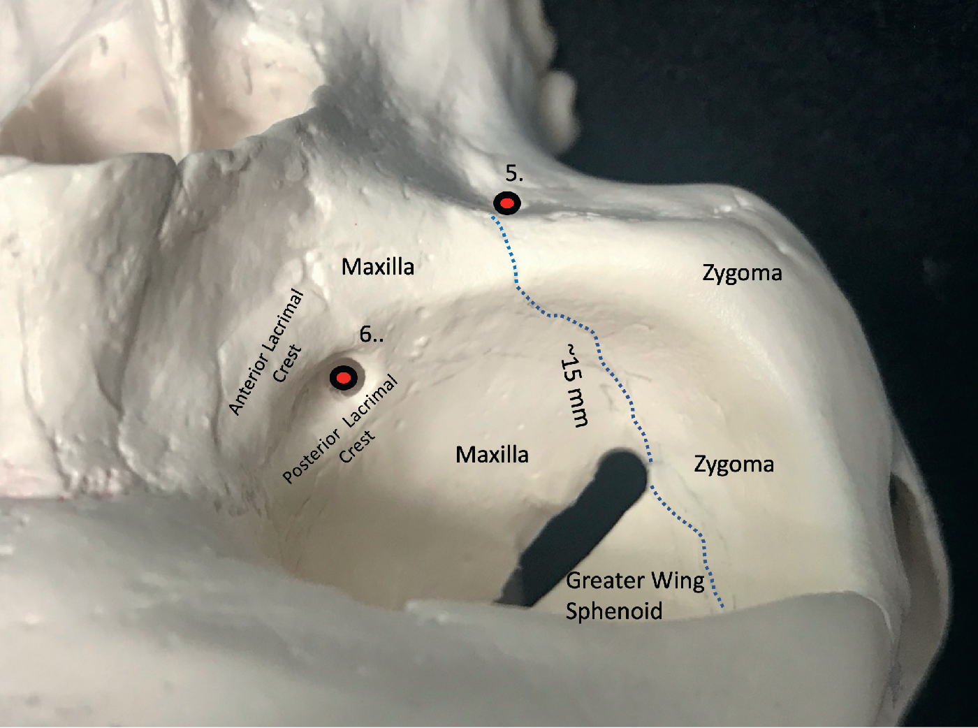 • The periorbital osteotomy must be posterior to the lacrimal crest and inferior to the turbinate to avoid injuring the nasofrontal duct.