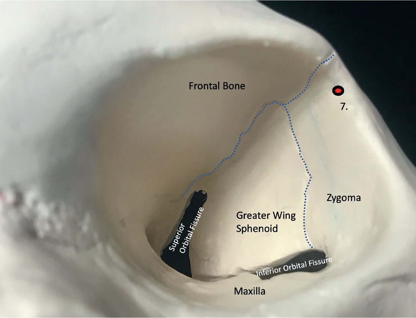 A number of vessels course through the lateral orbital wall will require cauterization. The zygomaticofacial and zygomaticotemporal neurovascular structures exit the orbit via their respective foramina on the lateral wall. Although encountered rarely, the surgeon should be aware of the one or more recurrent meningeal branches of the ophthalmic artery (internal carotid supply) that exit the orbit via the frontosphenoid suture to anastomose with the middle meningeal artery (external carotid supply).