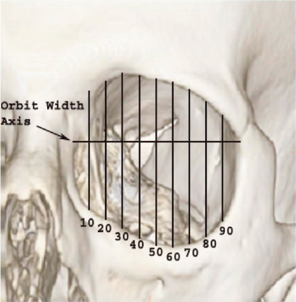 In the computed tomography (CT) analysis of the changes in the facial skeleton, Shaw et al. used a curvilinear analysis to measure incremental rim changes ( Fig. 13.1 ). They noted a statically significant increase in the distance at the superomedial rim along the 10-to-60 axis in females and the 10-to-40 axis in males. The inferolateral rim distance increased significantly along the 60-to-90 axis in females and the 50-to-90 axis in males. These changes were noted to occur between the young to middle age categories for females and the middle to old categories for males.