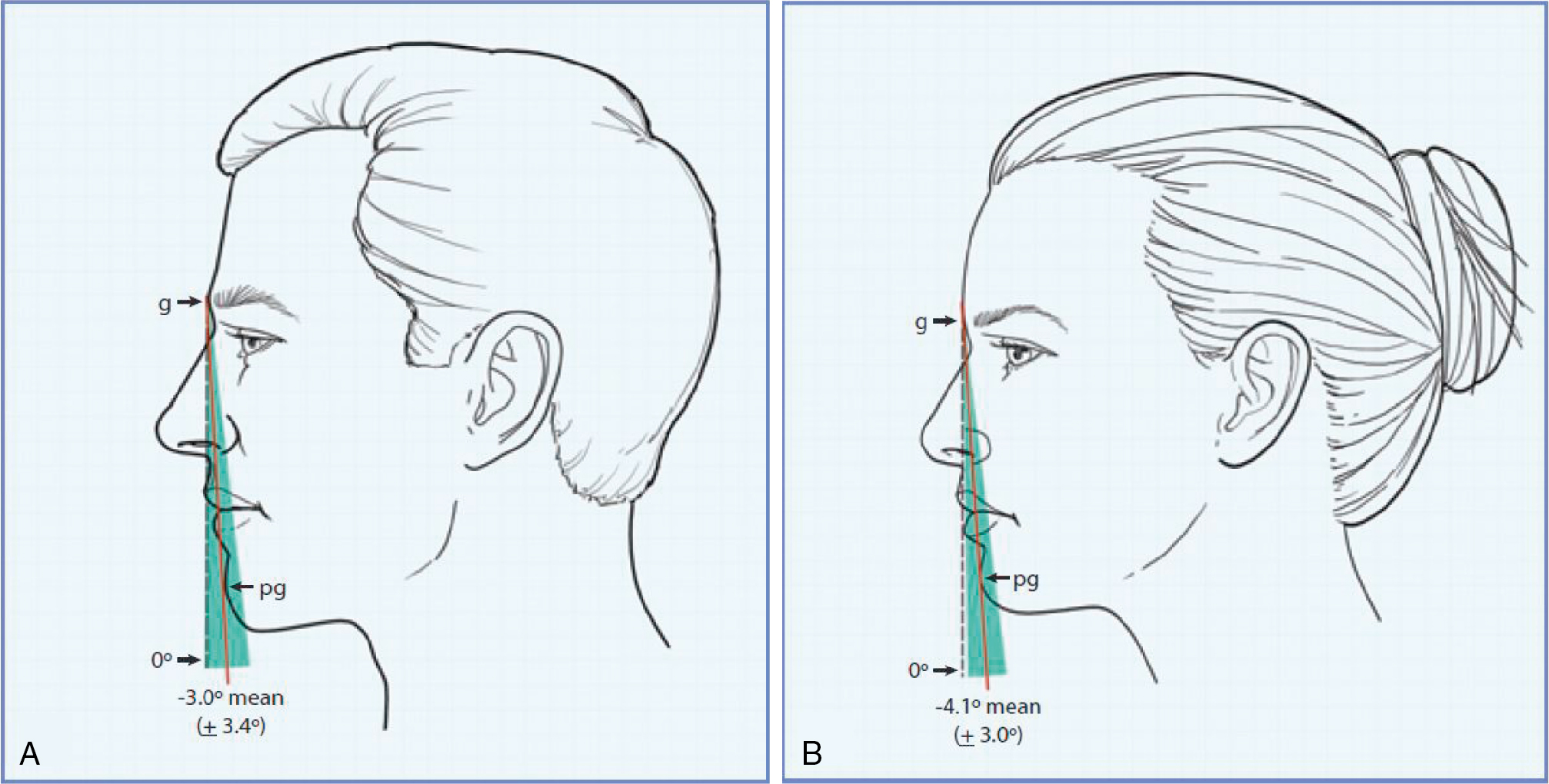 The inclination of the facial profile as defined by a line from the glabella (g) to the pogonion (pg). The broken line is drawn perpendicular to the Frankfurt horizontal at the inclination of 0 degrees. The solid red line represents the mean inclination of the study group. The shaded area encompasses 1 standard deviation (SD). The mean inclination in 100 young North American white men was −3 ± 3.4 degrees (A). The mean inclination in 100 young North American white women was −4.1 ± 3 degrees (B).