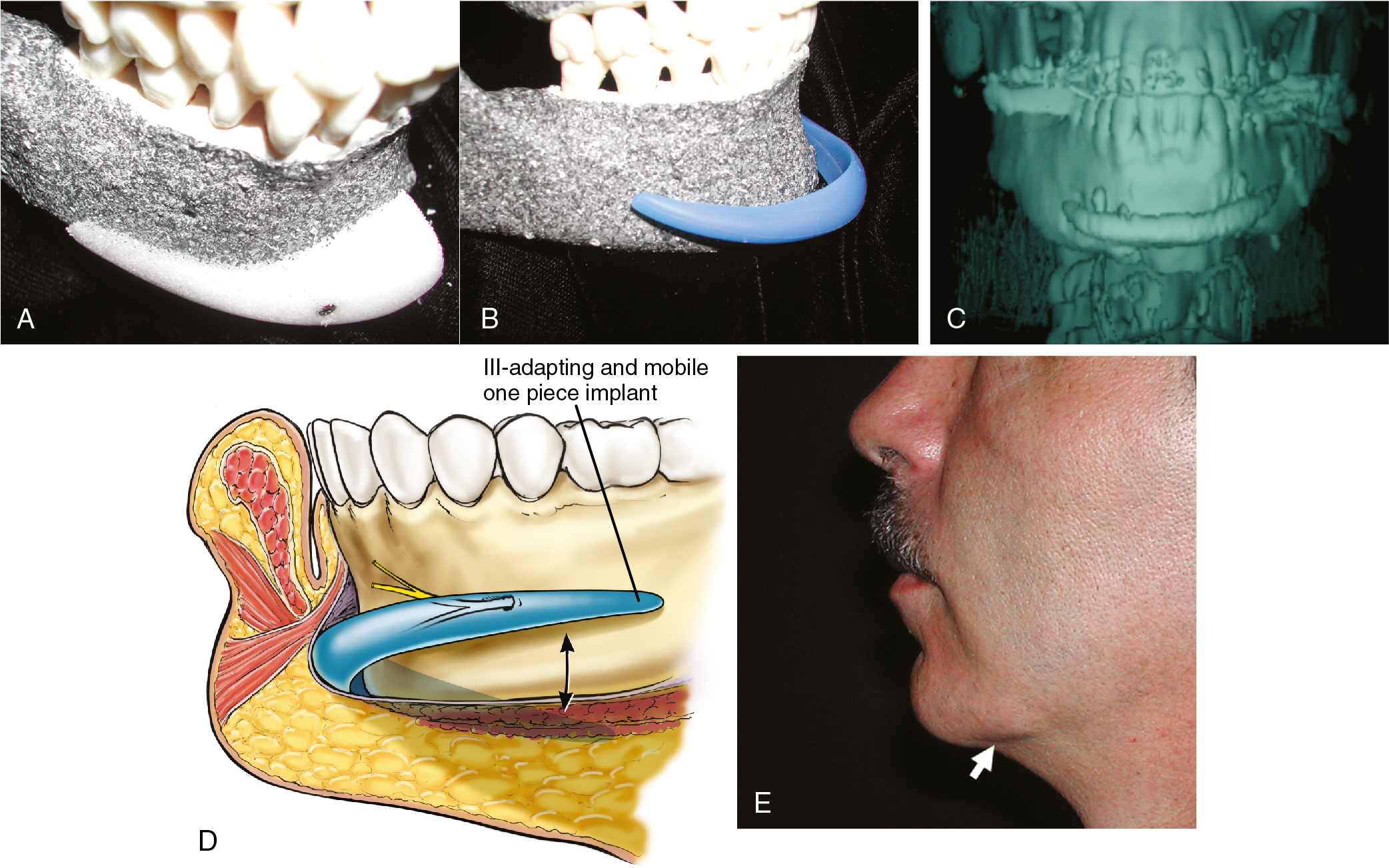 A one-piece implant, particularly one with lateral extensions, is unlikely to have the arc, projection, and inclination appropriate for every mandible ( Fig. 26.3 B). A two-piece design allows for adaptation of each of these parameters for a given mandible. When placed through the submental approach, the two-piece implant limits asymmetry in the horizontal plane. With one-piece implants, asymmetry in horizontal positioning increases as one proceeds laterally. It is not uncommon to find one end of an extended silicone implant impinging on the mental nerve, while the other end extends beyond the edge of the mandibular border ( Fig. 26.3 C).