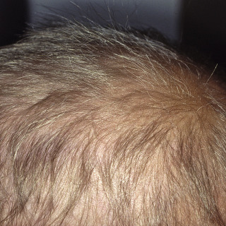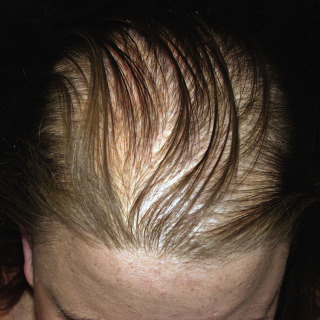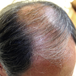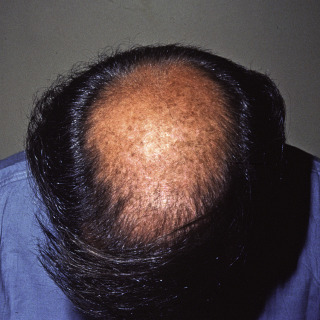 Moderately severe thinning of the frontoparietal area and crown in a man.