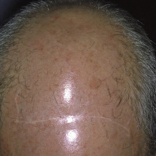 Almost complete loss of hair in the frontoparietal area and crown in a man. Note the scar from excision of a skin cancer.