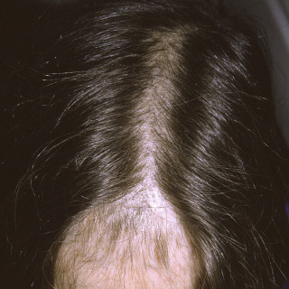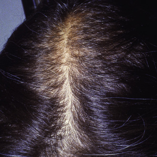 Typical diffuse pattern of hair loss on the vertex of the scalp in a woman.