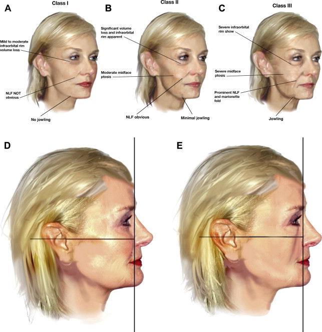 The authors found that, using this classification scheme, patients fit into 1 of 3 general categories (class I, II, and III) based on severity of midfacial aging ( Table 1 ). Furthermore, patients in each group can be subclassified as having either (1) normal skeletal anatomy; or (2) deficient skeletal projection in the midface ( Fig. 1 ). Finally, it is important to note that people age differently, with genetic and environmental factors contributing uniquely. Strict age-based classifications are thus inadequate. As such, age for each class is presented as a suggested range, although outliers exist in each group.