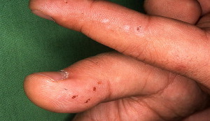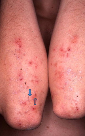DH can start at any age; rarely, it can be present in toddlers or in the very elderly, but the mean onset is generally in young adulthood or middle age. It is a chronic, very pruritic skin disease, characterized by 1- to 3-mm large papules, seropapules, vesicles, crusted erosions, and excoriations ( Fig. 1 ). Rarely, larger blisters can also develop. The lesions heal with hypopigmentation or hyperpigmentation. In young patients, urticarial plaques might be the predominant skin symptoms ( Fig. 2 ). The severe pruritus and scratching can result in extended lichenification ( Fig. 3 ). In the majority of cases DH is a polymorphic skin disease, and only rarely presents as a bullous dermatosis. Specific symptoms, not always present, are purpura on the fingers and toes, which alone may focus attention on the diagnosis ( Fig. 4 ).