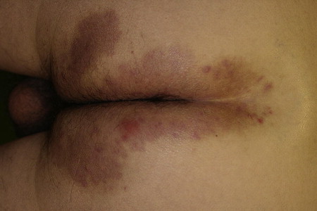 DH has a typical distribution of the skin symptoms; these are, in order of frequency (strongly supported by the author’s personal observations): 1, elbows and knees; 2, buttock; 3, shoulders, middle line of the back, and scapula; 4, scalp; 5 (rarely), purpura on the fingers and toes (see Figs 1–4 ).