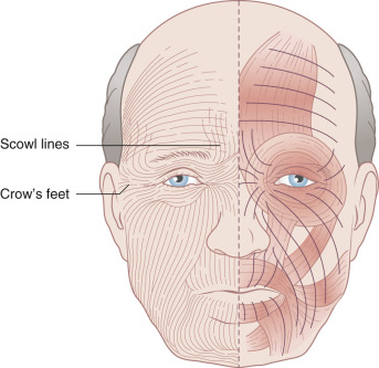 The lines and wrinkles that develop with age and sun exposure become an easily recognizable road map of the face. These wrinkles and creases, first noted as hyperanimation smile lines or frown (scowl) lines, may become permanently etched as elastic tissue degenerates and becomes ineffective in resisting the pull of the underlying muscles of facial expression. These are referred to as the relaxed skin tension lines (RSTLs; Fig. 1.2 ) and run perpendicular to the exertion of the mimetic muscles below. These lines are often the best choice for the placement of elective scar lines on the face. When they are readily apparent, no problem is posed in designing scar orientation. In younger people, having them animate by grimacing, wrinkling the forehead, smiling, or puckering will usually expose the RSTLs sufficiently to make the correct choice. Similarly, pinching the skin from various directions will also reveal the flow of the RSTLs. Scars not oriented within or parallel to the RSTLs are generally more noticeable, as they do not go with “flow” of the region. This is especially apparent when the patient is smiling or going through some other active form of dynamic emotional expression.