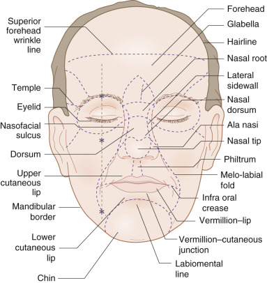 One of the major conceptual advances over the past decade or so in reconstructive and aesthetic surgery is the refinement and widespread acceptance of the junction lines and cosmetic (aesthetic) units of the face ( Fig. 1.3 ). Cosmetic unit junction lines are the lines on the face at the borders of the cosmetic units. They include the well-defined melo-labial fold that separates the cheek from the lip, the mental-labial crease that divides the chin from the cutaneous lower lip, the hairline, and the jaw line. More subtle junction lines separate the cheek from the nose (nasofacial) and lower eyelid from the cheek. The nose has several subunits defined by the alar groove, the dorsal crests, and the nasofacial line. Collectively these are the outlines that caricaturists use along with exaggerated features (broad forehead, wide-set eyes, protruding nose) to rapidly define an individual’s countenance and personality. They are also the best location for camouflaging scars. Since lines and shadows are anticipated in these areas, scars tend to visually disappear when placed within them. Conversely, scars crossing junction lines stand out as noticeable.