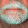 Damage also results in splotchy hyperpigmentation and hypopigmentation; vascular changes in the form of telangiectasia of the cheeks and poikiloderma of the neck and rims of the ears; and the signature damage of ultraviolet radiation, the deposition of solar elastotic material in the papillary dermis, giving the skin a yellowish, thickened, and leathery appearance.