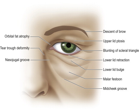 With aging, there is a downward slant from the medial to lateral canthus. The eye may appear hollow, with definitive demarcation from the brow to the upper lid and the lower lid to the cheek and midface. In most individuals, the palpebral fissure becomes smaller and rounder with age. The lid–cheek junction lies well below the infraorbital rim, 15–18 mm from the lid margin. Medial septal attachments and fat herniation can create unsightly nasojugal grooves and contribute to a tired appearance.