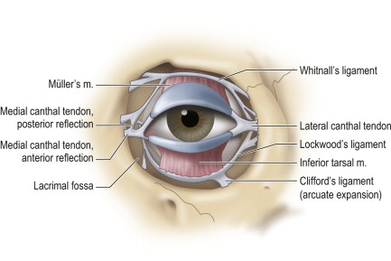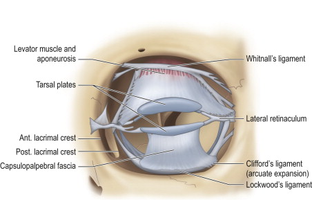 Lockwood’s ligament is an analogous structure in the lower lid which functions as a hammock to prevent descension of the globe. It stabilizes the lower lid on down gaze while the lower lid retractors cause lid depression, essentially increasing the inferior visual field during down gaze. Lockwood’s ligament arises from the medial and lateral retinaculum and fuses with the capsulopalpebral fascia inserting on the inferior tarsal border. The arcuate expansion of Lockwood’s ligament, Clifford’s ligament, inserts into the inferolateral orbital rim and fuses with the interpad septum between the central and lateral fat compartments of the lower eyelid. The arcuate extension is often kept during blepharoplasty to maintain some septal support.