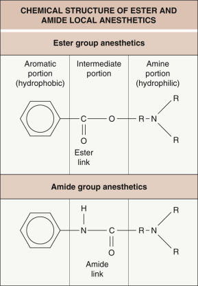 Local anesthetics are classified into two groups, depending on the linkage in the intermediate chain ( Table 143.1 ). Amide anesthetics have an amide linkage and ester anesthetics have an ester linkage (see Fig. 143.1 ). They differ in how they are metabolized and in the risk of sensitization. Ester anesthetics are hydrolyzed by plasma pseudocholinesterase, and the metabolites are excreted by the kidneys. Patients with a deficiency of functional pseudocholinesterase, who are often diagnosed after prolonged paralysis following administration of standard doses of succinylcholine, are at an increased risk of ester anesthetic toxicity. The metabolite para-aminobenzoic acid (PABA) is responsible for the allergic reactions seen with ester anesthetics. Amide anesthetics are metabolized by the hepatic microsomal cytochrome P450 enzyme system, and the metabolites are excreted by the kidneys. Patients with severe liver disease may be at increased risk of amide anesthetic toxicity.