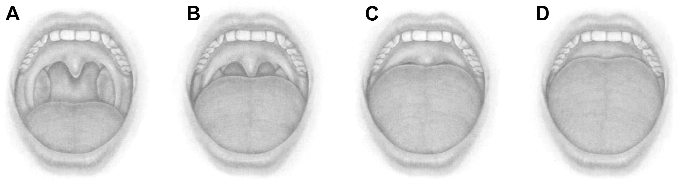 Pediatric patients presenting for craniofacial procedures may present the anesthesiologist with airway challenges, and thus, the airway evaluation is an essential part of the history and examination. The airway examination includes the evaluation of the patient’s craniofacial anomalies, cervical mobility, oropharynx, and work of breathing. Cervical extension is critical to opening the upper airway. In patients with Goldenhar syndrome as well as other skeletal dysplasias, there may be reduced cervical extension due to varying degrees of vertebral fusion. The size and shape of the head, midface, mandible, presence of cleft lip and/or palate, along with dentition and tongue size should be noted. When appropriate, anesthesiologists assign a Mallampati score, a noninvasive assessment of the tongue base relative to oral opening, which predicts visualization of the glottis ( Fig. 1 ). Work of breathing including the patient’s position, respiratory rate, and retractions provide evidence of airway obstruction and pulmonary reserve. Pediatric craniofacial syndromes and associated airway anomalies are described in Table 2 .