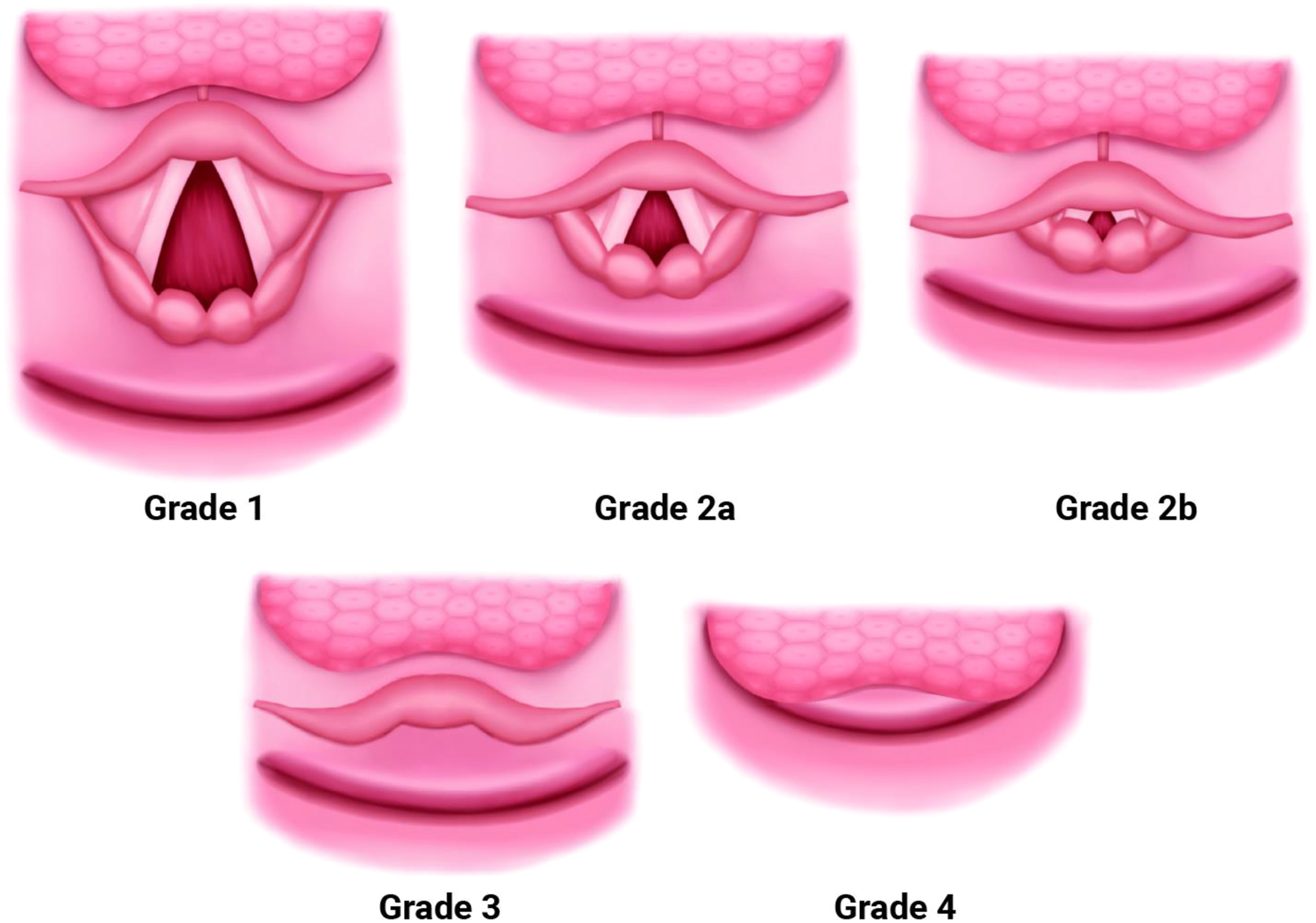 With conventional direct laryngoscopy, the patient is placed in a “sniffing” position to align the axes of the airway: oral, pharyngeal, laryngeal. With laryngoscopy, the Cormack–Lehane (CL) grade of the glottic opening predicts the difficulty of intubation ( Fig. 2 ). CL grades range from 1, a full view of the glottic opening, to 4, which is visualization of only the soft palate. In patients at risk for cervical fusion, such as those with Crouzon, Apert, and Goldenhar syndromes, limited cervical extension increases the difficulty of intubation.