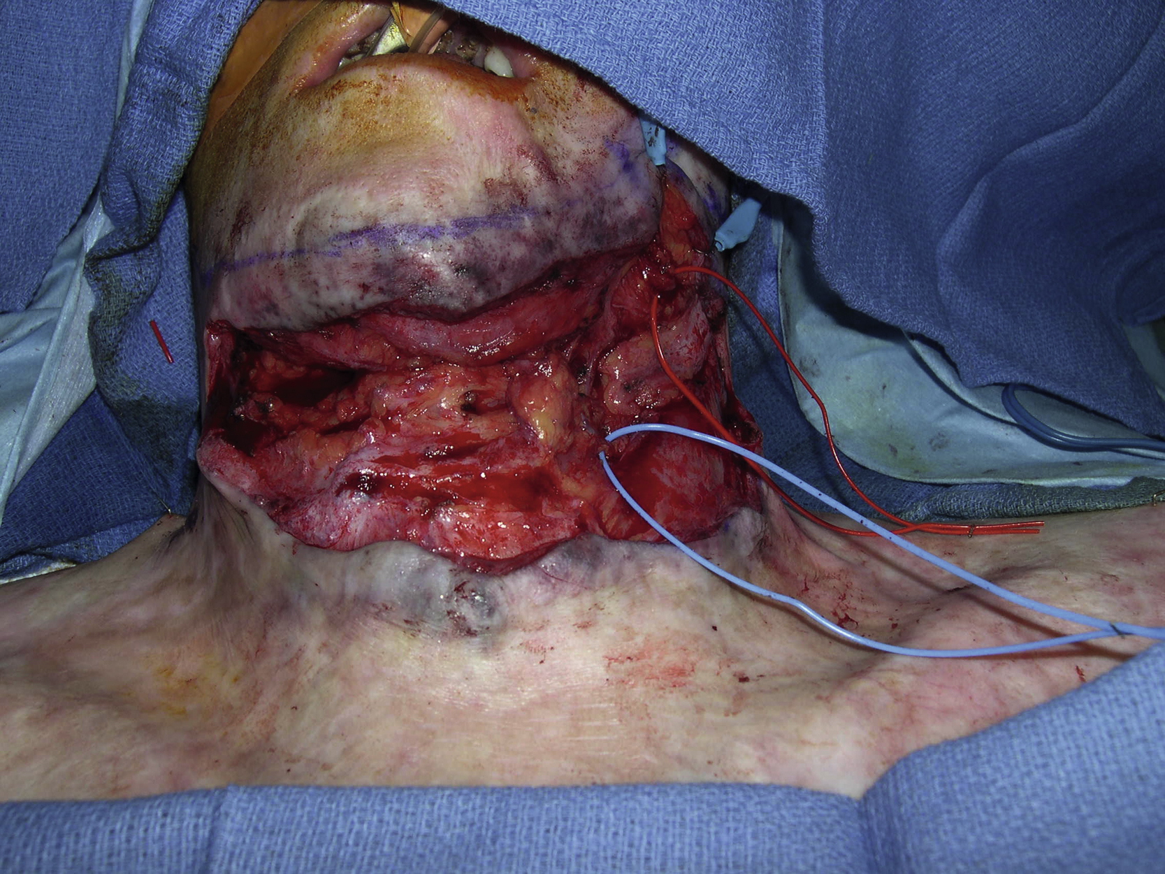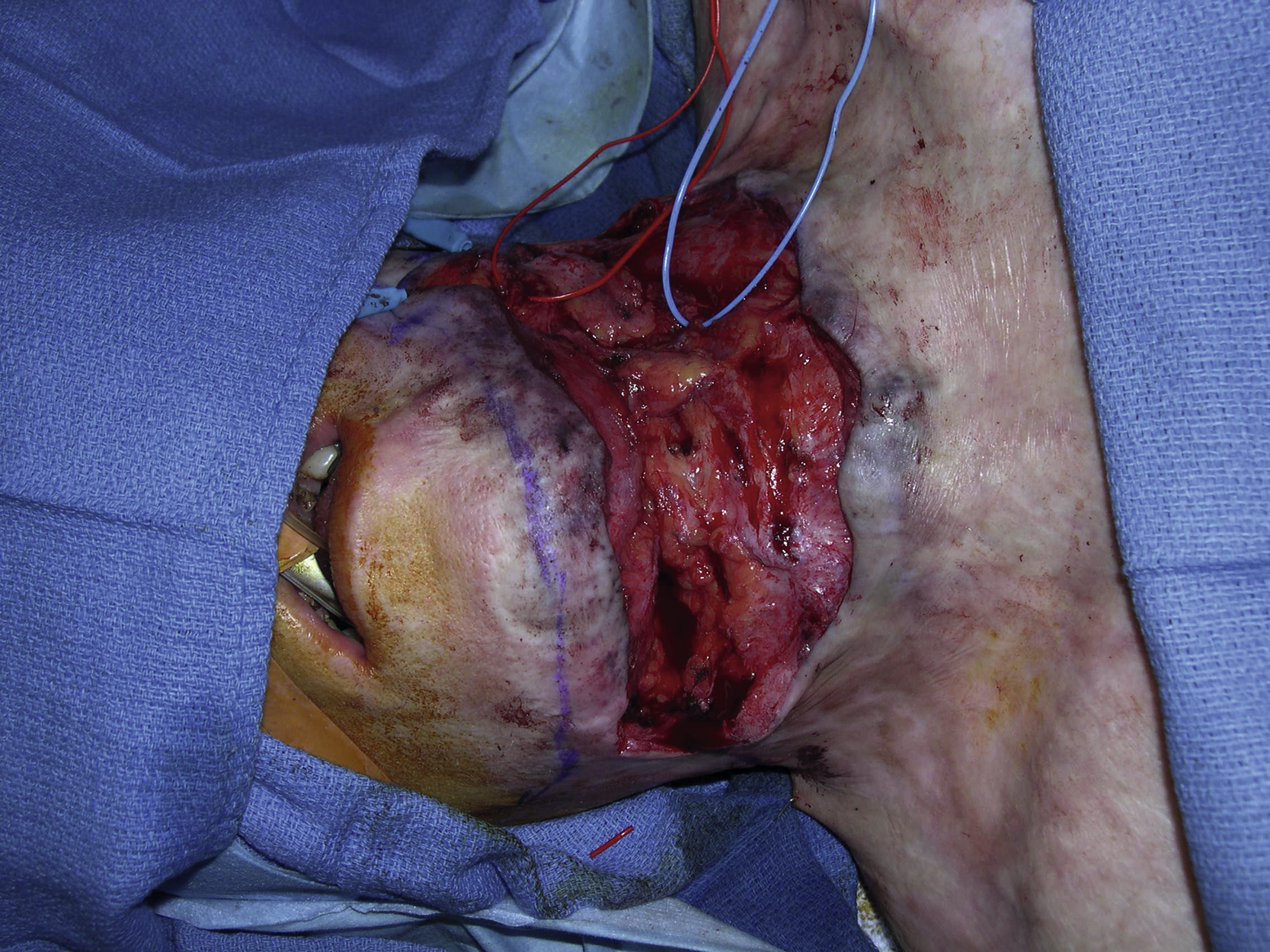 Under general anesthesia, the patient was taken to the operating room for release of the neck scar contracture and a planned free ALT perforator flap. The scar contracture was completely released once the incision was made at the base of the neck scar. After an extensive surgical dissection, the size of the neck soft tissue defect was measured as 16 × 9 cm ( Figs. 11.3 and 11.4 ). The left facial artery and superior thyroid vein were dissected as recipient vessels for microvascular anastomoses.
