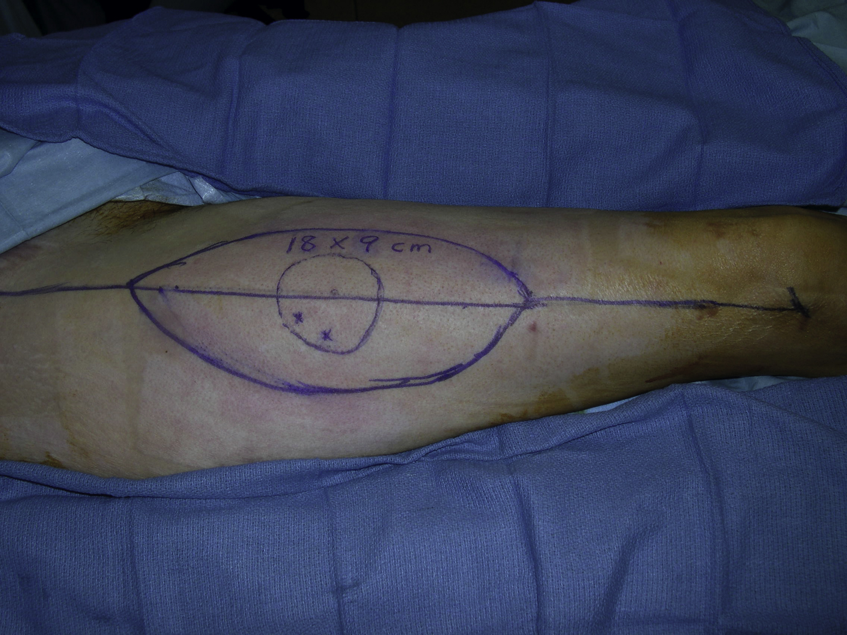 A standard right ALT perforator flap was marked and two perforators were identified by a handheld Doppler ( Fig. 11.5 ). Unfortunately, after the skin paddle of the flap was elevated, the previously identified perforators were not found. During further flap dissection, a large perforator near the proximal side of the flap was identified ( Fig. 11.6 ). The perforator appeared to be of adequate size (approximately 3 mm). There was a strong signal based on the handheld Doppler. Based on the principles of free-style free flap, the intraoperative decision was made to convert the free ALT flap to a free-style free flap ( Fig. 11.7 ). A lengthy and challenging intramuscular dissection was performed until the length of the pedicle was determined to be adequate and the diameter of the pedicle was big enough for microvascular anastomoses ( Fig. 11.8 ). The pedicle was divided and the free-style free flap dissection, based on the same donor site, was completed ( Fig. 11.9 ).