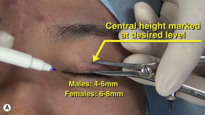 Careful marking is essential for surgical success. Compared to the Occidental eyelid, the Asian eyelid crease is 2–4 mm lower, with males averaging 4–6 mm and females 6–8 mm centrally ( Figure 5.1 ). The height of the central eyelid crease provides the foundation for the newly created crease. Calipers are used to mark the central eyelid height bilaterally and this is compared for symmetry.