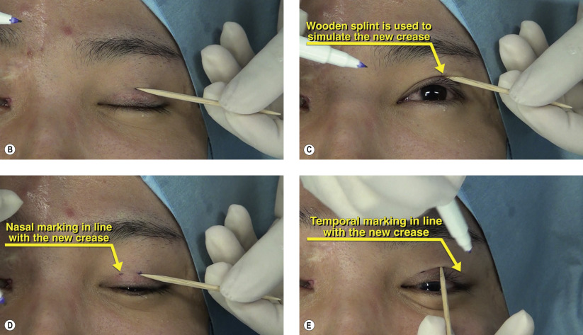Once the central height of the new eyelid crease is determined, three markings are made along this newly proposed crease. A wooden splint is used to indent the central marking and to simulate the new crease ( Figures 5.1B and 5.1C ). As the patient is asked to look up and down, the surgeon evaluates the new crease to determine if it will be natural. If the crease appears too high, then the central height is lowered and a new crease is simulated with the wooden splint. Once satisfied, nasal and temporal markings are made in line with the new crease ( Figures 5.1D and 5.1E ). The markings are best performed while the patient looks down and then reconfirmed when looking up. Excess ink from the marking pen should be blotted with a gauze to minimize bleeding of the dye on the skin.
