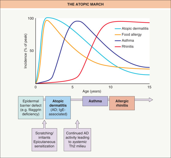 Atopic dermatitis (AD) is the most common chronic inflammatory skin disease, and its increasing prevalence presents a major public health problem worldwide . Characteristic features of AD include pruritus and a chronic or chronically relapsing course, usually beginning during infancy (early onset) but occasionally first developing in adulthood (late onset) . AD is a complex genetic disease and is often accompanied by other atopic disorders such as allergic rhinoconjunctivitis, asthma, food allergies, and less often eosinophilic esophagitis. These conditions may appear simultaneously or develop in succession. AD and food allergy have a predilection for infants and young children, while asthma favors older children and rhinoconjunctivitis predominates in adolescents. This characteristic age-dependent sequence is referred to as the “atopic march” ( Fig. 12.1 ). Given that atopic disease progression starts with AD, management should not be concentrated solely on the treatment of acute flares, but also be directed towards ameliorating the underlying genetically determined epidermal barrier dysfunction and preventing active dermatitis via maintenance therapy. Such an approach could potentially block the sensitizations and ongoing inflammation that drive the atopic march .