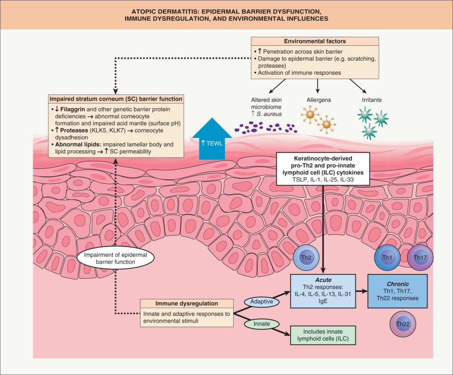 The pathogenesis of AD can be divided into three major categories: (1) epidermal barrier dysfunction ; (2) immune dysregulation ; and (3) alteration of the microbiome. Each of these can be modulated by genetic and environmental factors ( Fig. 12.2 ).
