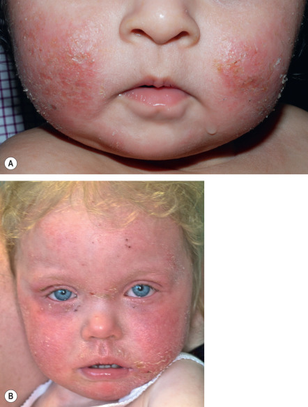 A Erythema with scale-crust on the cheeks. Note the sparing of the central face. B More severe, widespread facial dermatitis with accentuation of scale-crust around the mouth.