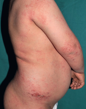 • Typical eczematous morphology and age-specific distribution patterns (see Fig. 12.3 )