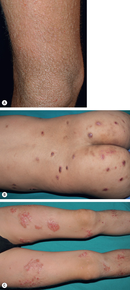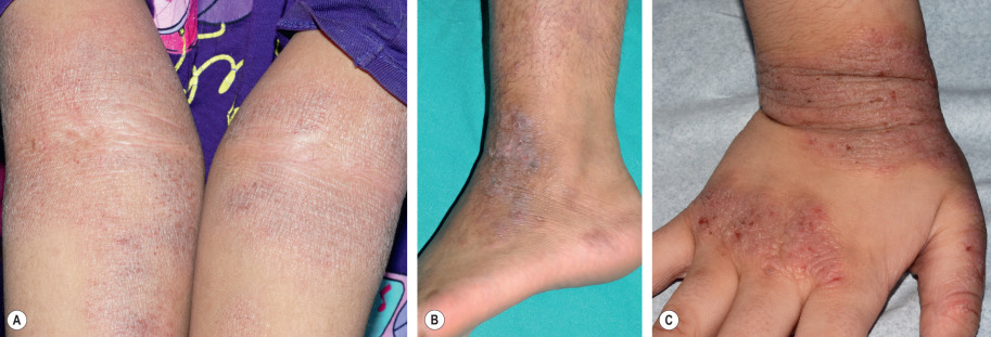 A Lichenification, scale, and punctate excoriations in the antecubital fossae. B Coalescing papules and lichenification on the ankle due to chronic scratching and rubbing. C Thick eczematous plaques with excoriation on the dorsal hand and wrist.