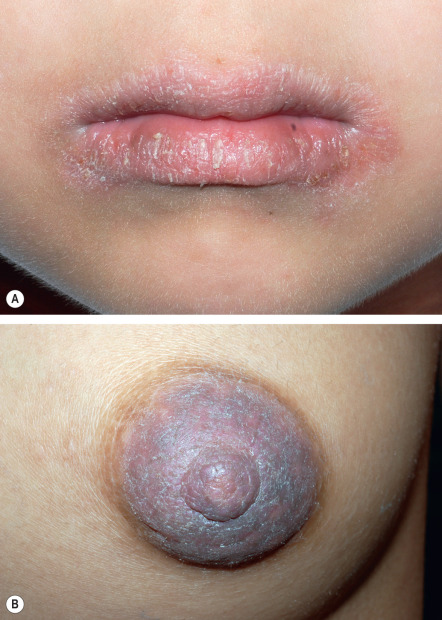 A Atopic cheilitis involving both the vermilion lip and surrounding skin (lip licker’s eczema). B Nipple eczema in an adolescent.