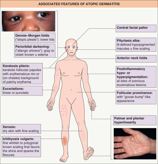 atopic dermatitis, atopy, skin barrier, xerosis, lichenification, keratosis pilaris, Dennie–Morgan lines, pruritus, IgE, Th2, eosinophilia, food allergy, dupilumab, eczema herpeticum, filaggrin