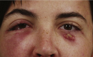 A patient with right orbital cellulitis. Note the malar streaking and periorbital erythema. She was admitted and started on IV antibiotics. Within 48 h, the cellulitis had improved and she was discharged on oral antibiotic therapy.