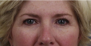 The patient 6 weeks following blepharoplasty. Note the areas of erythema and raised nodules particularly at the lateral canthal area.