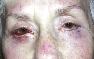 Infections which occur less than 2 weeks after blepharoplasty present with tenderness, warmth, erythema and underlying fluctuance. This is a typical presentation for a staph or strep infection and is most commonly confirmed by cultures. Patients may present with a febrile course with or without leukocytosis. All patients with a documented orbital cellulitis should have blood cultures if febrile. Quick determination of bacterial sensitivities is essential for optimal outcome. Periorbital Group A strep is a very serious infection that can rapidly spread and develop into orbital cellulitis or necrotizing fasciitis within a short period of time following initial presentation. A warm tender eye with proptosis may indicate post-septal extension of the cellulitis. Additionally, these patients may exhibit ptosis, diplopia, or ophthalmoplegia. This is a serious finding and a detailed physical exam, visual acuity examination and CT scan of the orbits should be performed immediately.
