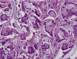 Additional causes of localized inflammation in addition to suture granuloma include granuloma formation from foreign body ( Figure 15.5 ). Common causes include powder from surgical gloves, makeup including eye shadow and mascara, retained ophthalmic ointment, or liquefied fat following blepharoplasty. These are typically diagnosed at the time of biopsy with confirmation by appearance of foreign body on polarized light. Additionally, lipogranulomas can form which are different than non-caseating granulomas with respect to localized inflammatory processes around fat cells. Oil cyst can also occur either from liquefied fat or localized fibrosis and inflammation around ophthalmic ointment. Treatment includes conservative management and the majority of patients spontaneously resolve with time and treatment of underlying inflammation with low dose steroids including a Medrol Dose Pack.