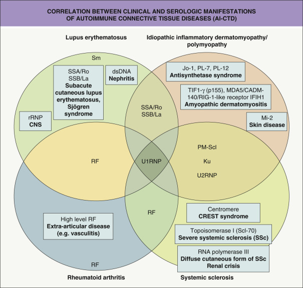 Although the various AI-CTDs are distinct clinical entities, they can have features in common. Consequently, each AI-CTD has aAb specific to that particular disorder as well as other aAb that are shared with the other diseases. In addition, some patients can display overlapping clinical features of several different AI-CTDs and, as a result, an overlap in the pattern of aAb production ( Fig. 40.1 ).