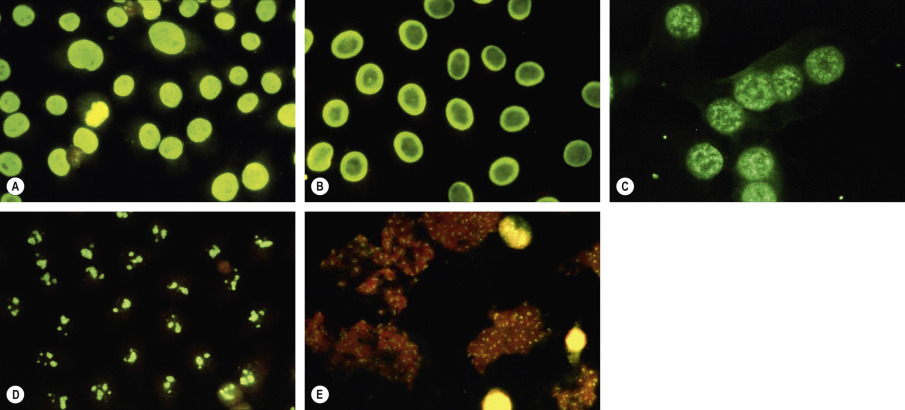 Utilizing Hep-2 tumor cells as the substrate, patterns of nuclear immunofluorescence include: homogeneous ( A ); peripheral ( B ); speckled ( C ); nucleolar ( D ); and centromeric ( E ). E is illustrated on a chromosome preparation in metaphase arrest.